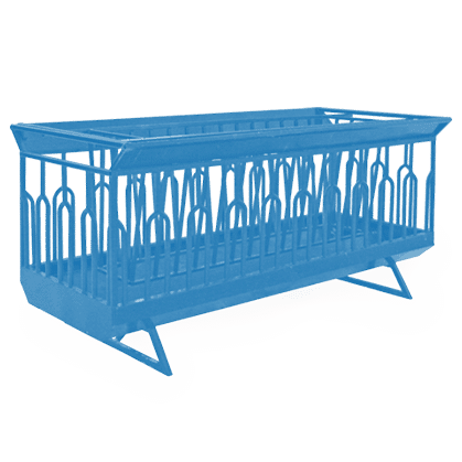 #SB8 Small bale feeder with 26 feeding spaces 26 feeding spaces Design forces goats to lift heads to enter and exit feeder, reducing wastage Feeds hay & grain Dimensions: 96″l x 44″w x 38″h