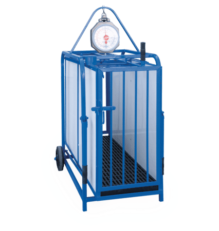 PN440 Sheep and goat scale Both doors open from same end Shorter wheel base for easier maneuverability Also ideal for shipping hogs Solid wheels & slatted floor Optional digital display and self catch head gate also available. Scale extender bars also available (#141381) Outside Dimensions: 52″l x 28″w x 56″h Inside Dimensions: 48"l x 15"w x 30"h Weight Capacity: 440 lbs (analog)