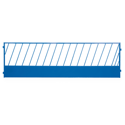 #SBF Slant bar manger for sheep 1″ x 1″ tube frame with 12″ skirt ½” slant rods with 7″ spacing Sections link together with ⅝” pins Dimensions: 12’ x 36″h