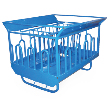 #SB4 Small bale feeder with 15 feeding spaces 15 feeding spaces Design forces goats to lift heads to enter and exit feeder, reducing wastage Feeds hay & grain Dimensions: 48″l x 44″w x 38″h