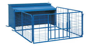 12 bu 14 ga MIG welded steel tank Adjustable openings on creep panel end gate Slide-back water proof lid Moves easily on skids Collapsible for easy shipping and transport