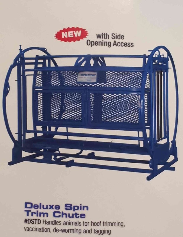 All-In-One spinning hoof trimmer and self-catch head gate. Makes less appealing tasks easier. Fully adjustable to fit all sizes of sheep and goats. Shown with padded sides (sold separately) *NEW SIDE DOORS* Both sides, doors front and back for easy access for vaccinating and ultrasound imaging. 62"l x 43"w x 45"h