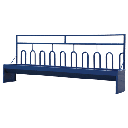 #BF96 Bunk feeder with 10 feeding spaces 10 feeding spaces (tombstone or slant bar) Works as free standing unit or can be attached to make a feed front Feeds hay & grain Dimensions: 96″l x 16″w x 40″h